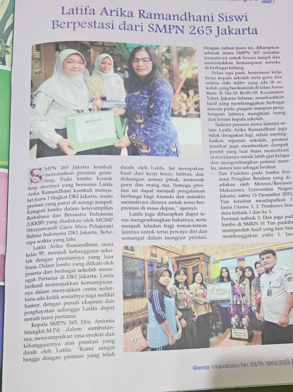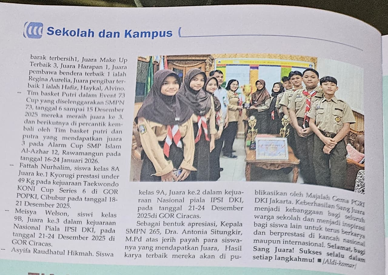 SMP Negeri 265 Jakarta kembali menorehkan kebanggaan melalui prestasi peserta didiknya. Salah satu siswa berprestasi SMP Negeri 265 Jakarta mendapatkan kesempatan untuk dimuat dalam Majalah Gema edisi bulan Maret di halaman 45. Pemuatan ini menjadi bentuk apresiasi atas kerja keras, dedikasi, serta pencapaian yang telah diraih oleh peserta didik dalam bidang akademik maupun nonakademik.